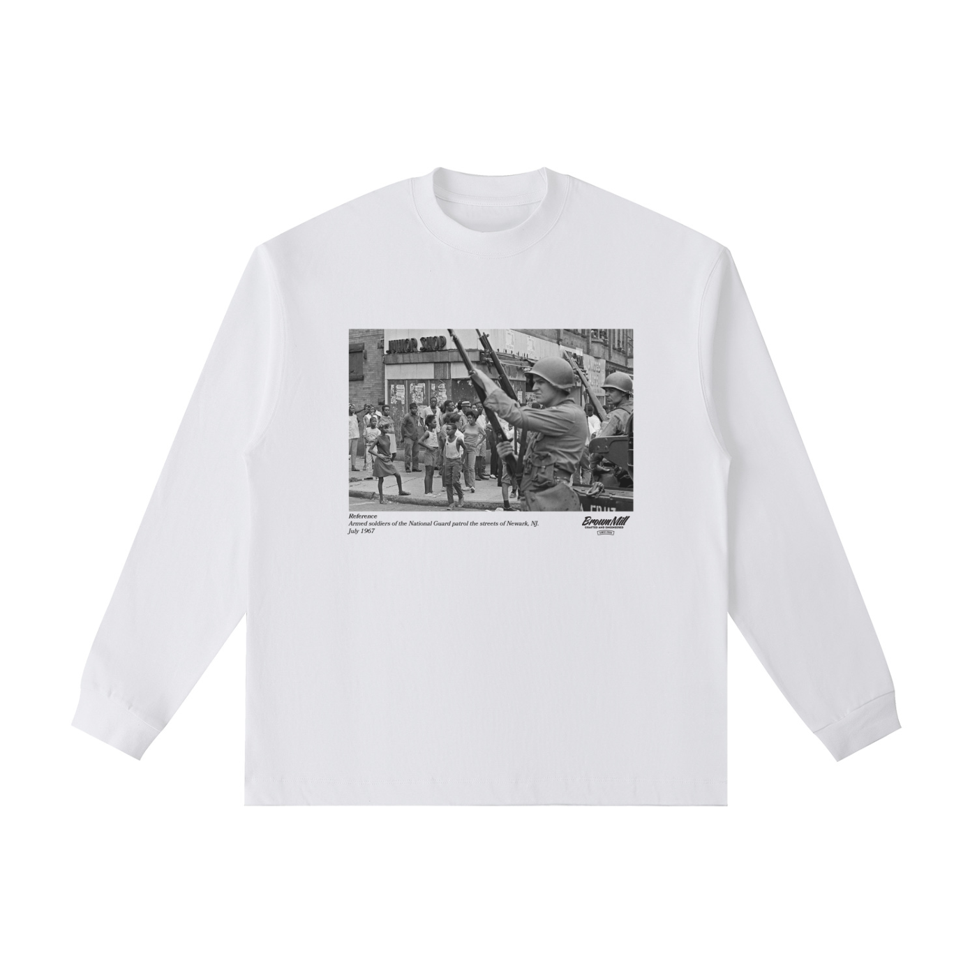 Make a powerful statement with this archival inspired long sleeve shirt featuring a historic street scene from the Newark riots in Newark.
