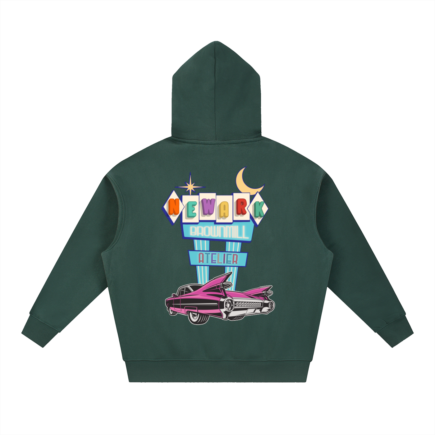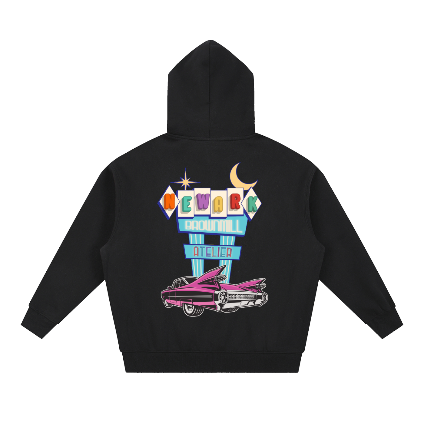 On the back, that same nostalgic diner sign sits alongside a vintage car, capturing the spirit of adventure and cool, laid-back vibes of the '60s. This design is a tribute to both timeless style and modern comfort, perfect for those who appreciate the retro aesthetic.